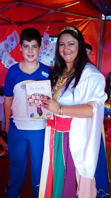 De lá, fui conhecer o estande da turma, a 7ª A. Aí, foi danado... Eles fizeram uma tenda cigana! Coisa mais linda do mundo, com direito a mesa com bola de cristal, baralho cigano e muitas almofadas. Dentro da tenda, eles fizeram uma verdadeira exposição sobre o meu trabalho, com painéis de fotos me mostrando em atividade (já são 15 anos, né?), com as minhas obras e até com um cordel do meu conto "O maníaco da feira de Caruaru", que levou o segundo lugar no concurso de contos “Recortes de Caruaru”, promovido pelo Instituto Histórico de Caruaru (IHC), Faculdade de Filosofia, Ciências e Letras de Caruaru (FAFICA) e a Academia Caruaruense de Cultura, Ciências e Letras (ACACCIL).